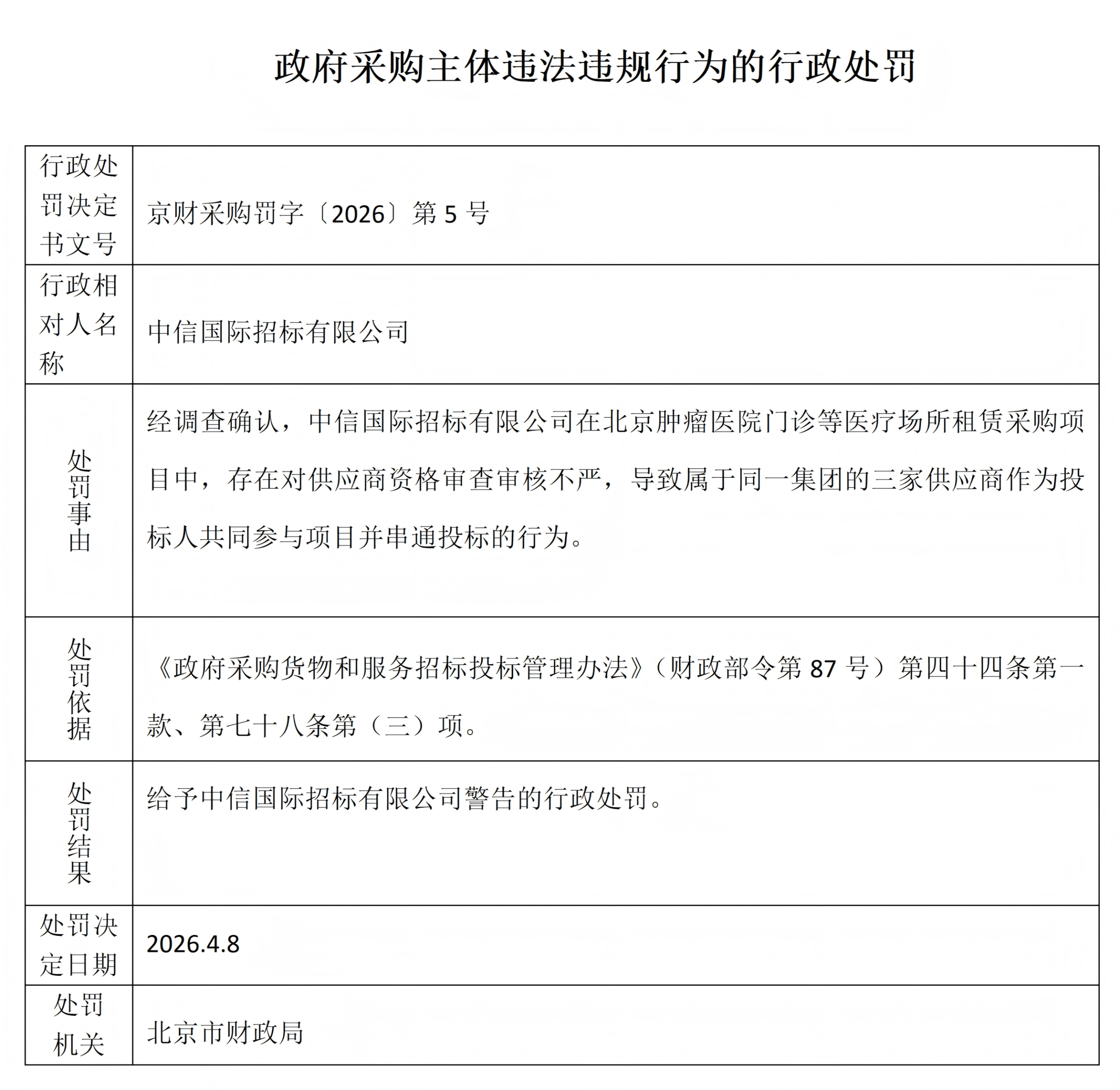 北京市财政局关于中信国际招标有限公司的行政处罚决定书