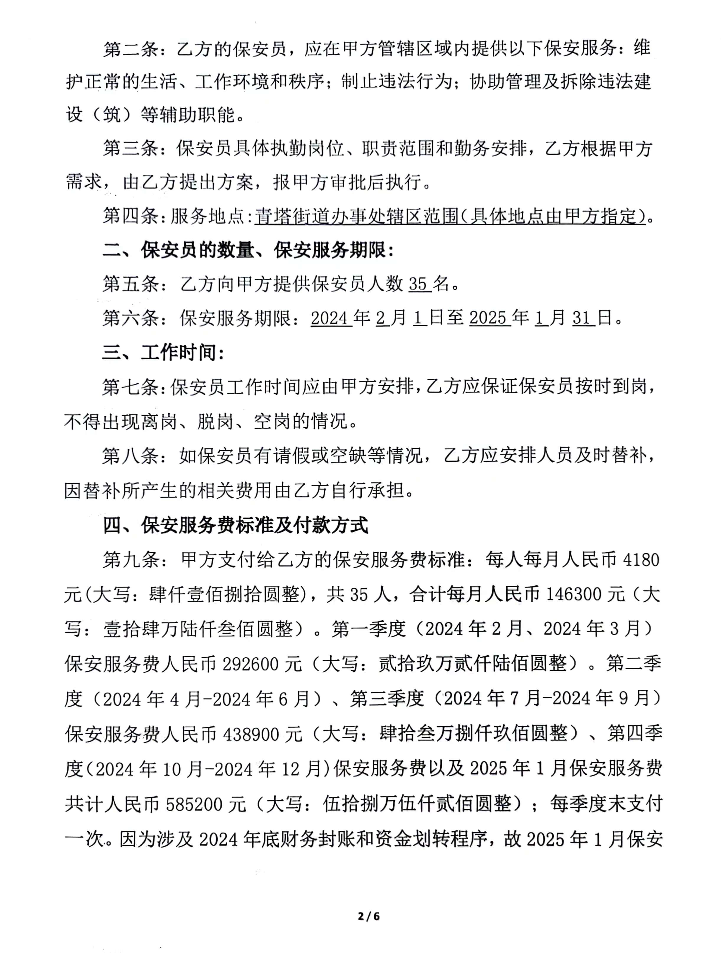 二、合同名称: 2024年民生实事及基层建设-环境治理及城管执法队保安服务采购项目政府采购合同