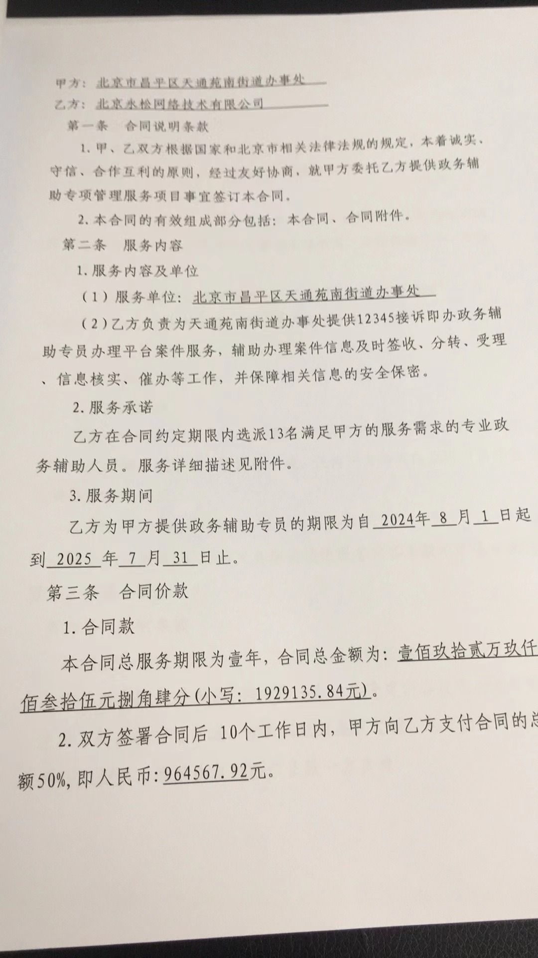 二、合同名称: 2024年天南街道办事处政务辅助专项服务政府采购合同