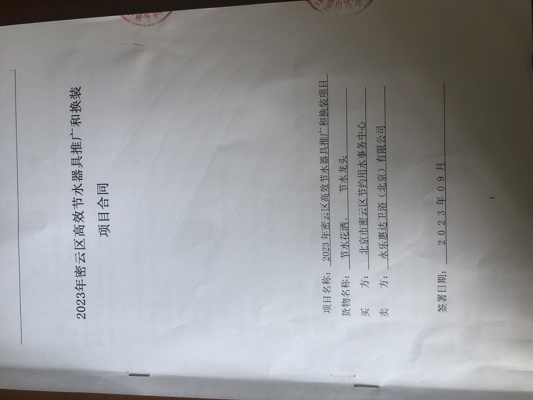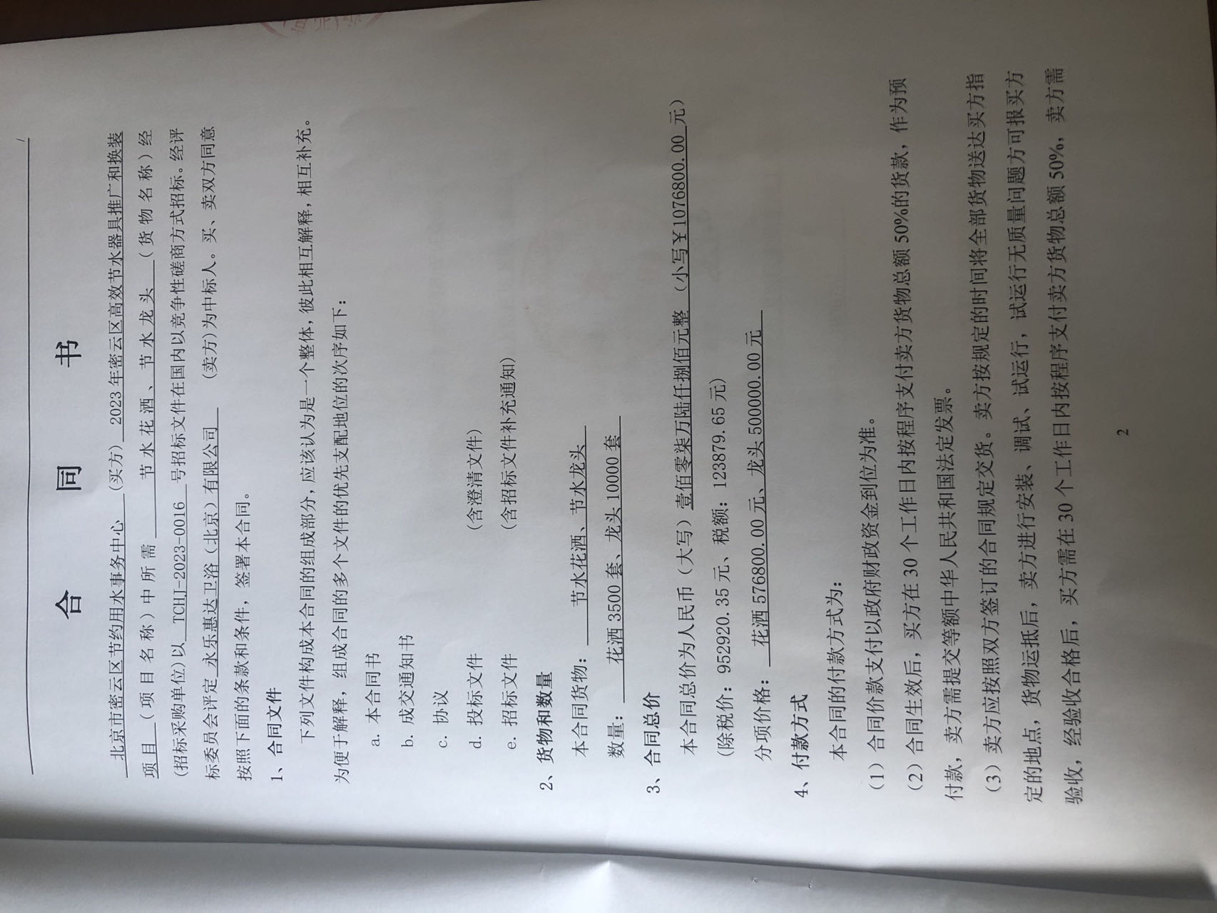二、合同名称: 2023年密云区高效节水器具推广和换装项目政府采购合同