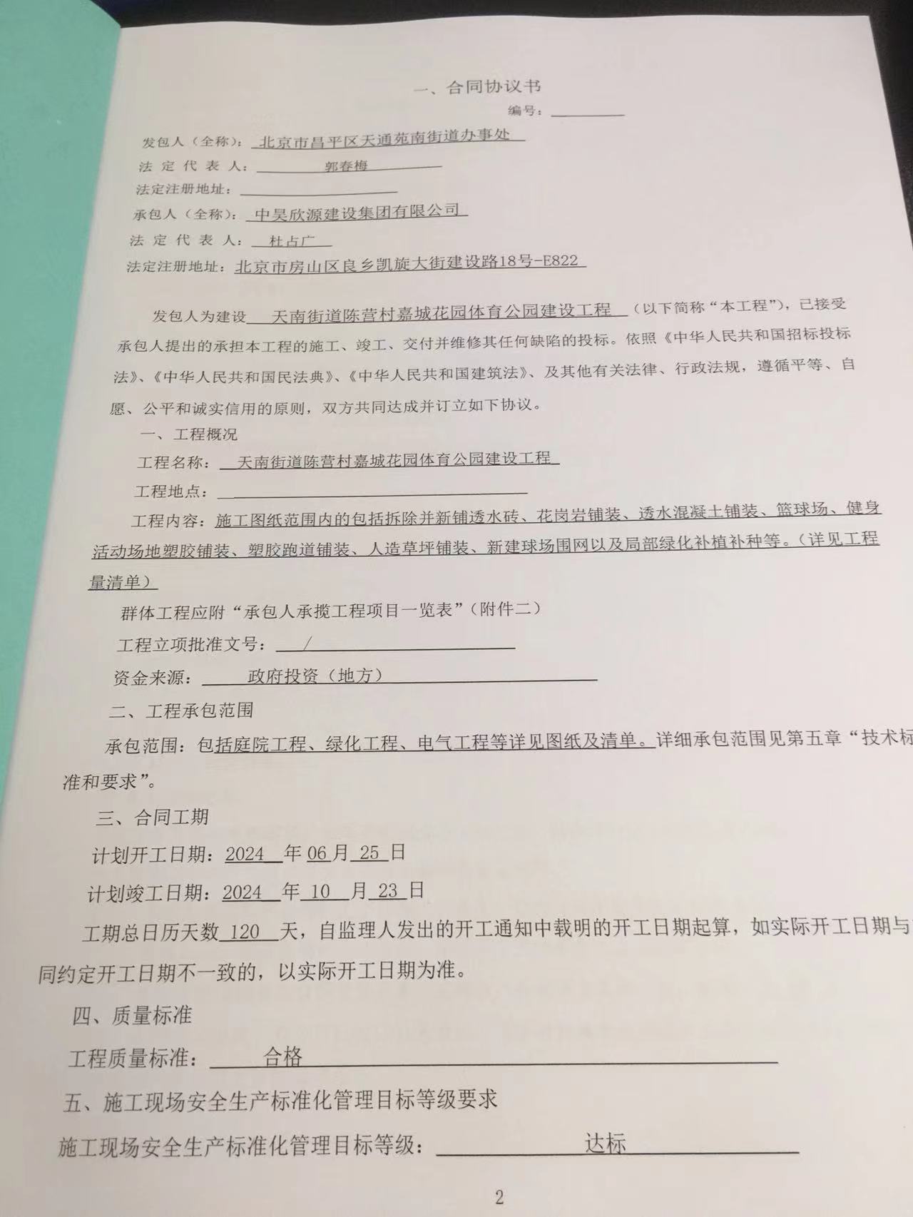 二、合同名称: 天南街道陈营村嘉城花园体育公园建设工程政府采购合同