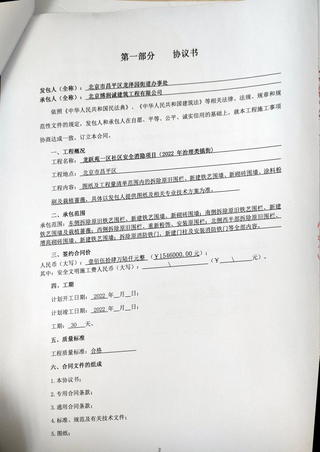 二、合同名称: 龙跃苑一区社区安全消隐项目(2022年治理类镇街)政府采购合同