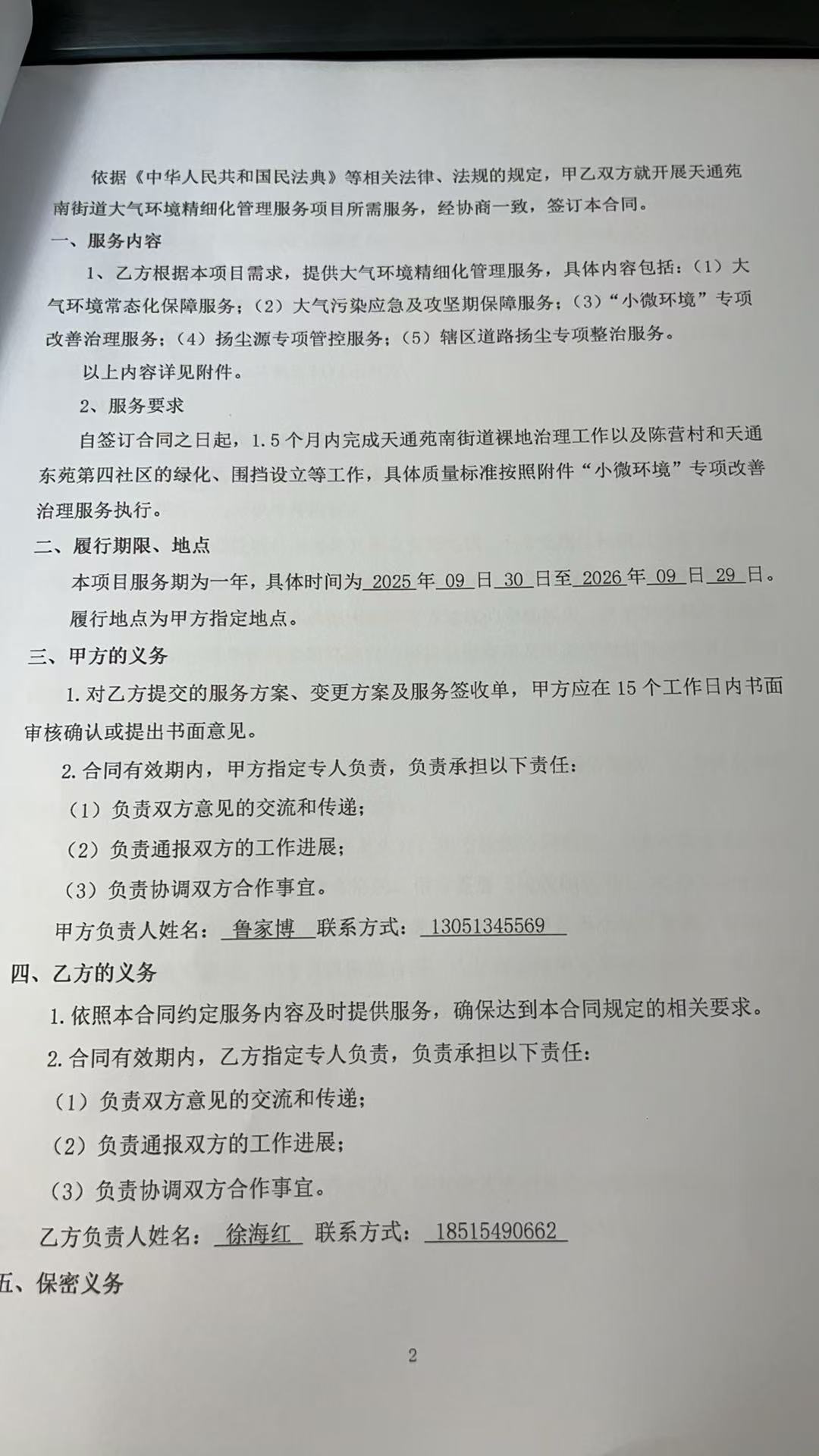 二、合同名称: 天通苑南街道大气环境精细化管理服务项目政府采购合同