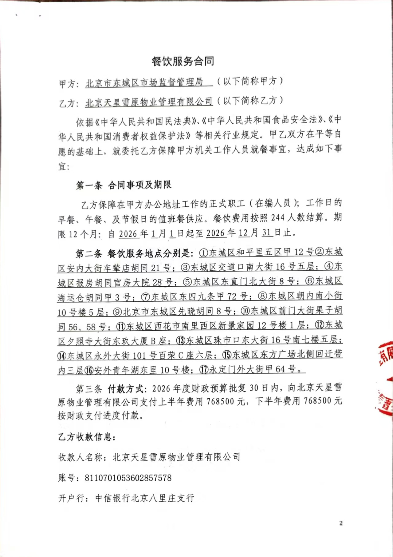 二、合同名称: 东城区市场监督管理局食堂经费政府采购合同