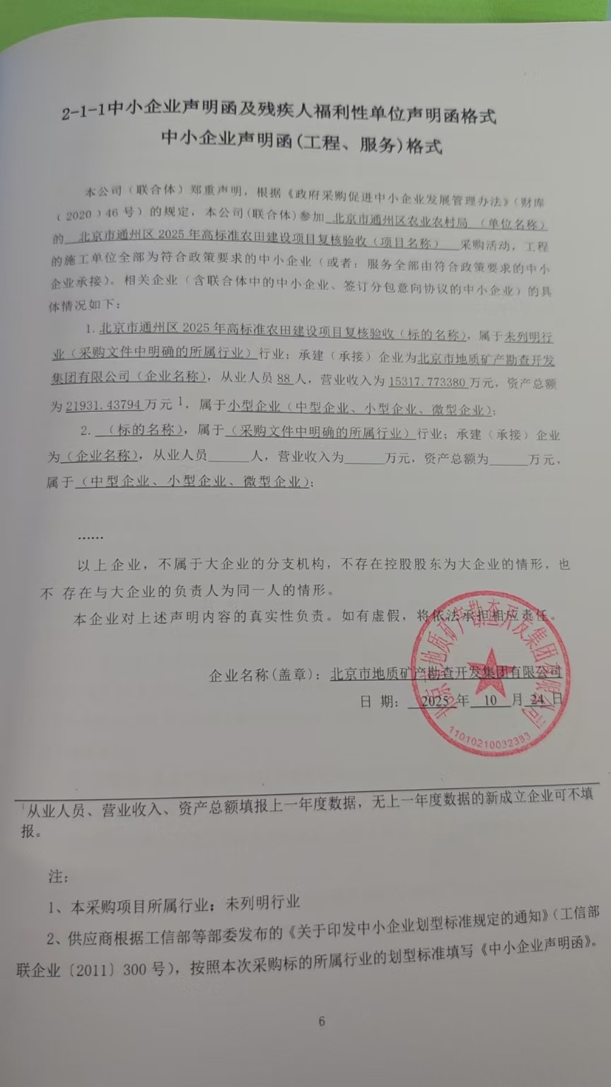| 北京市地质矿产勘查开发集团有限公司 | 1 | 110.28万元 | 110.28万元 | 完成2025年高标准农田建设项目复核验收工作 |