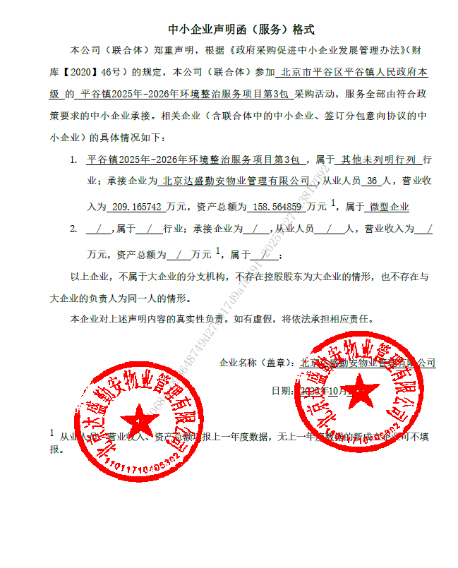 | 北京达盛勤安物业管理有限公司 | 北京市平谷区平谷镇府前西街40号205室-2098(集群注册) | 91110117MA019HJ71Y | 43.5504 万元 | 评审总得分(综合评分法): 77.83 分 |