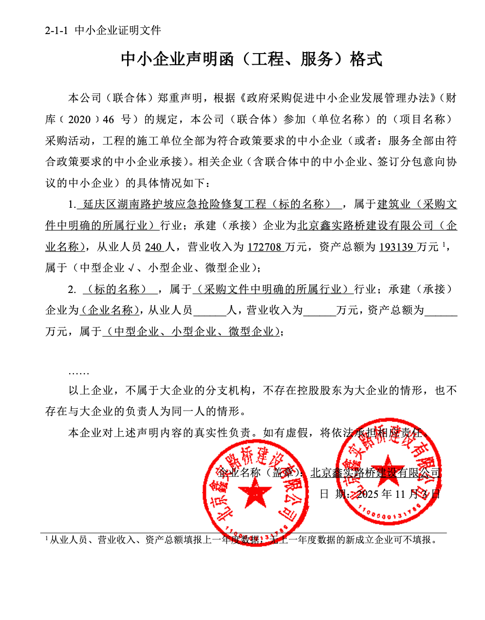 简要技术需求或服务要求:延庆区湖南路护坡应急抢险修复工程工程量清单及图纸涉及的全部内容。