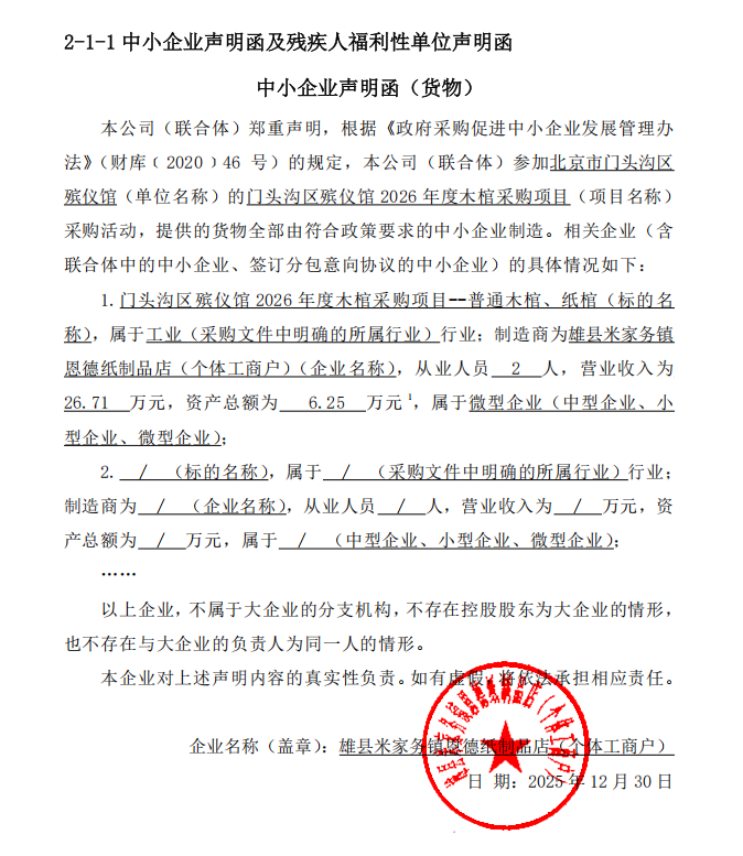 门头沟区殡仪馆2026年度木棺采购项目--普通木棺、纸棺 |