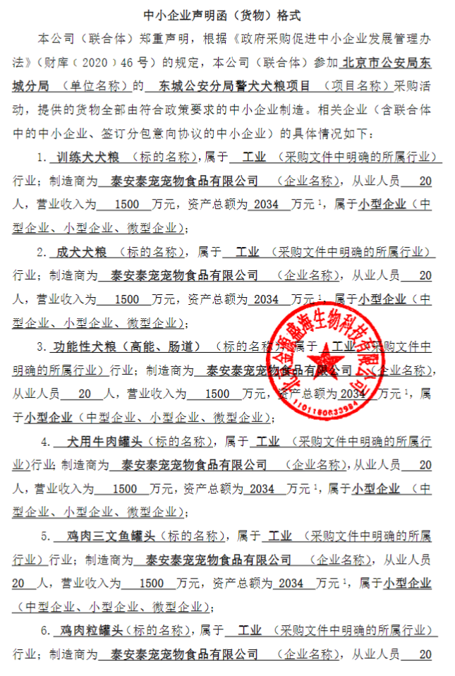 | 北京金源盛海生物科技有限公司 | 功能性犬粮(高能、肠道) | 规格:15kg/袋,型号:全价派仕佳高能训练犬犬粮 | 5000 | 0.0042万元 | 21万元 | 详见采购需求 |