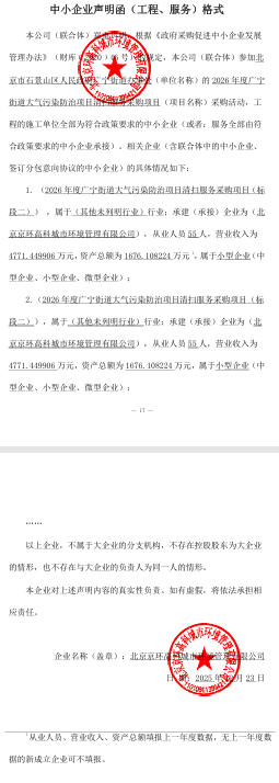 | 北京京环高科城市环境管理有限公司 | 北京市海淀区四季青镇闵航路3号院13号2层206室 | 91110108MA01E0WU3D | 66.88176 万元 | 评审总得分(综合评分法): 87.67 分 |