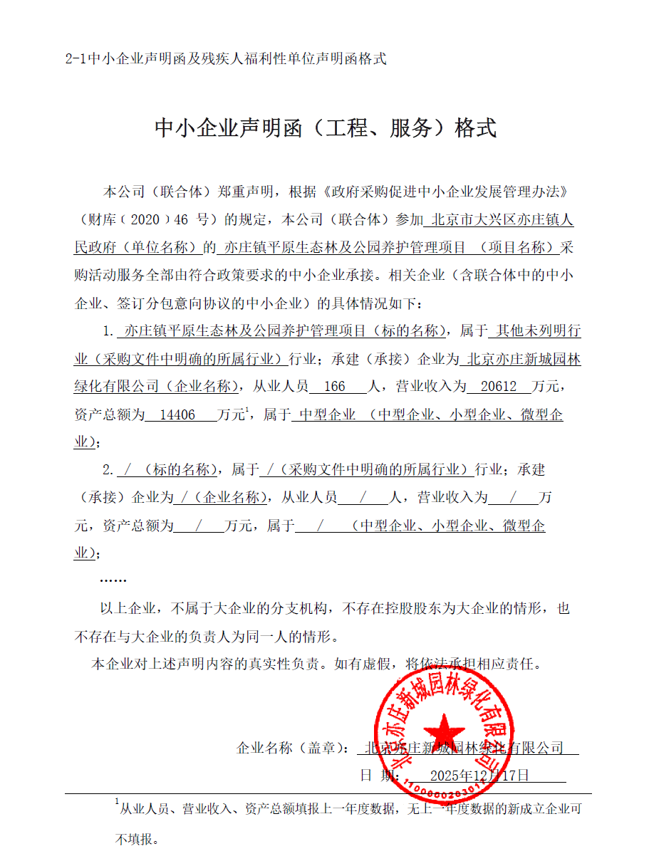 | 北京亦庄新城园林绿化有限公司 | 1 | 2149.044666万元 | 2149.044666万元 | 对亦庄镇平原生态林及亦新郊野公园、梧桐公园、樱花公园、亦庄公园的林木绿地、设备设施、园内道路等进行养护管理,进一步强化全镇绿化美化功能,保护绿化成果,为居民提供优良环境。服务时间3年。合同一年一签。 |