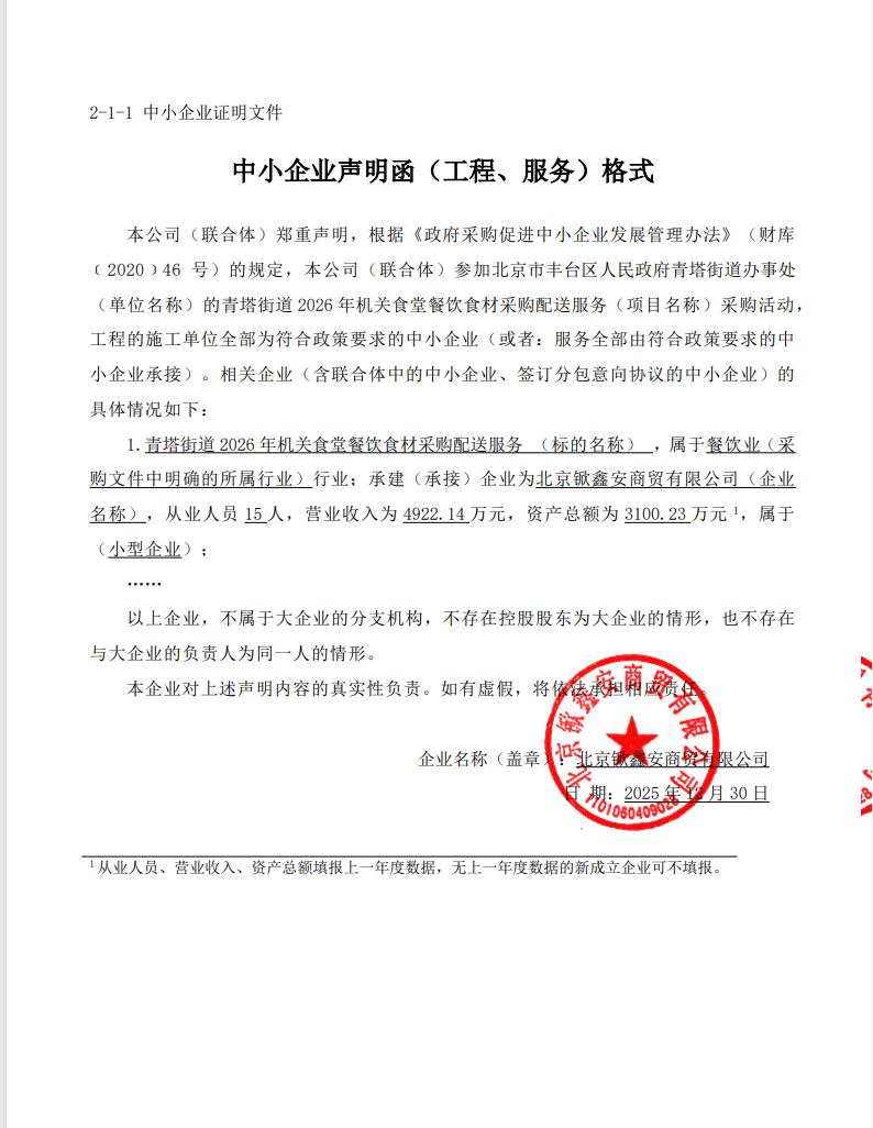 | 北京锨鑫安商贸有限公司 | 1 | 146.5万元 | 146.5万元 | 青塔街道2026年机关食堂餐饮食材采购配送服务 |