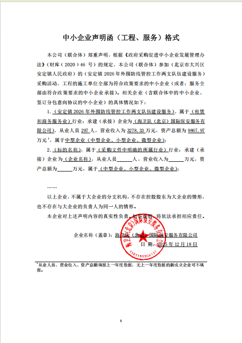 | 海卫队(北京)国际保安服务有限公司 | 1 | 186.9999万元 | 186.9999万元 | 主要负责外围防线乡村道路卡口勤务落实,外围防线实地巡视检查,重点查控躲避检查绕道进京车辆及人员,以及巡视检查现有物技防设施损坏等情况。 |