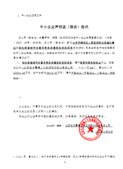 | 北京东方慧博人力资源顾问股份有限公司 | 1 | 943.055376万元 | 943.055376万元 | 劲松街道城市协管员劳务派遣服务采购项目 |