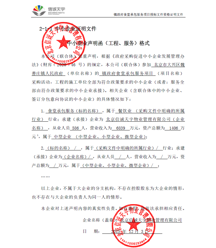 | 北京信诚天宇物业管理有限公司 | 1 | 475.78269万元 | 475.78269万元 | 本项目采购食堂承包服务。项目预算金额:480万元。合同履行期限:二年,合同一年一签。 |