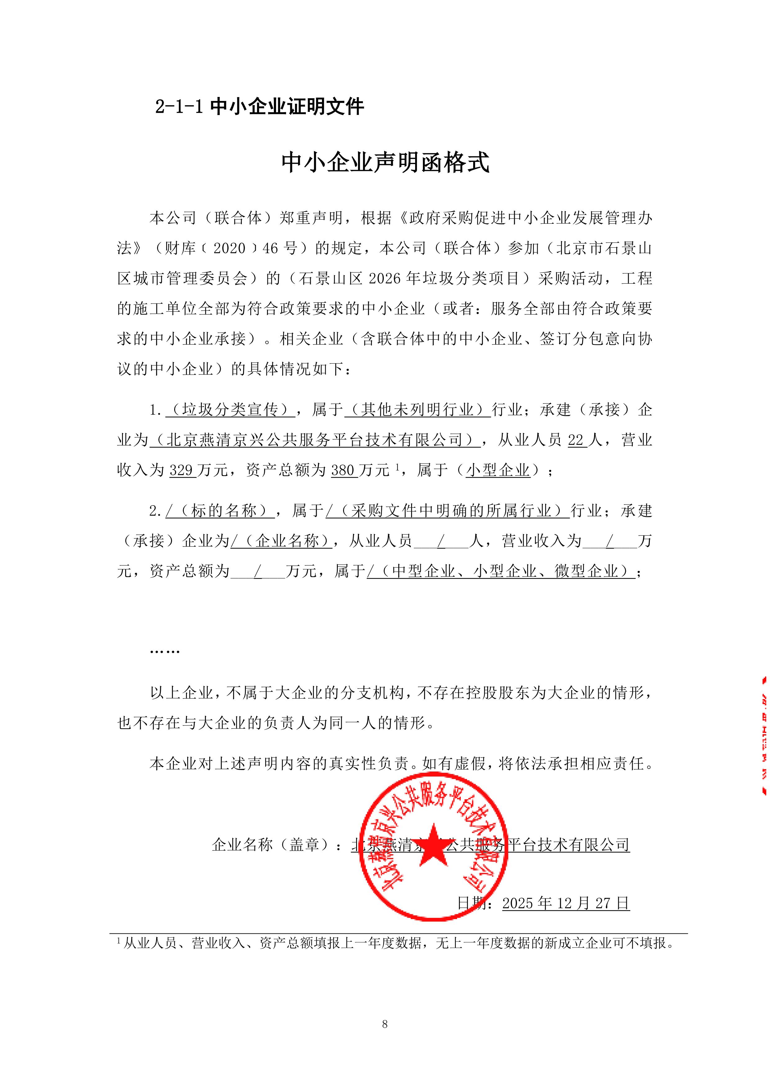 | 北京燕清京兴公共服务平台技术有限公司 | 1 | 59.9万元 | 59.9万元 | 开展区级层面垃圾分类宣传动员。2026年1月1日至2026年12月31日,共计365天 |