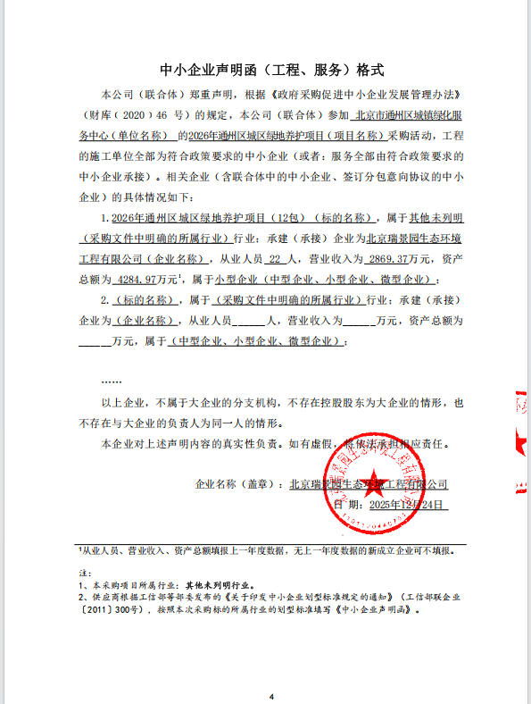 | 北京瑞景园生态环境工程有限公司 | 1 | 397.050066万元 | 397.050066万元 | 2026年通州区城区绿地养护项目(12包)养护内容包括但不限于:浇灌、修剪、 中耕除草、施肥、 有害生物防治、更新、调整、补植、植物防护、 树体损伤处理、复壮、 绿地保洁、景观水体管理、 安全保护、档案管理、绿地内附属设施管理、绿地防火、园林废弃物收集运输、协助采购人开展临时任务 |