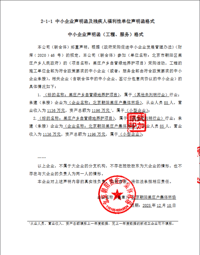 中标成交供应商名称:北京朝阳黑庄户集体林场