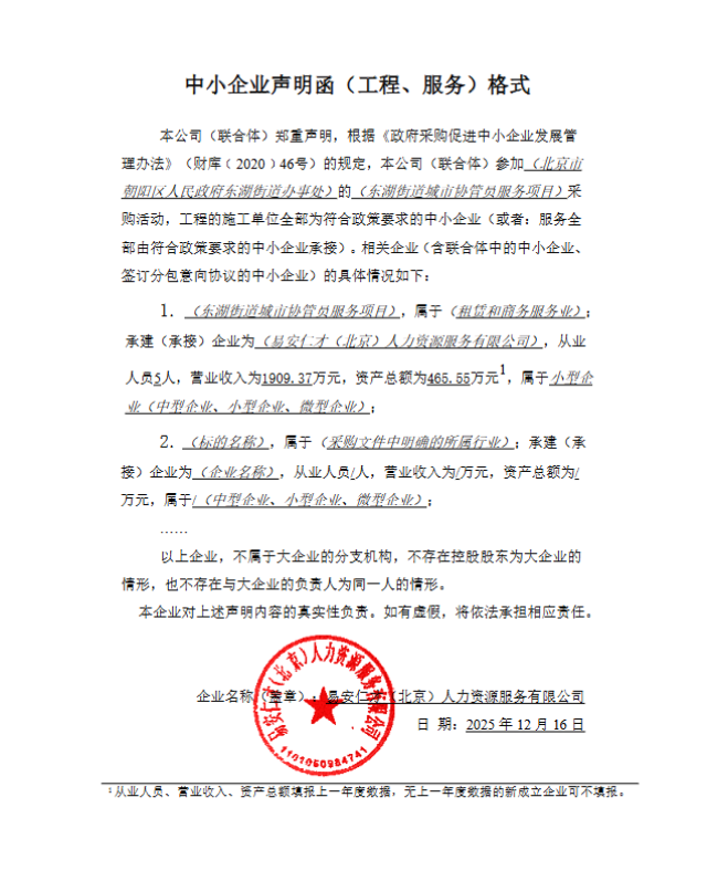 | 易安仁才(北京)人力资源服务有限公司 | 北京市朝阳区西大望路63号院1号楼2层208 | 91110105MA00251K1Y | 921.5712 万元 | 评审总得分(综合评分法): 89.8 分 |