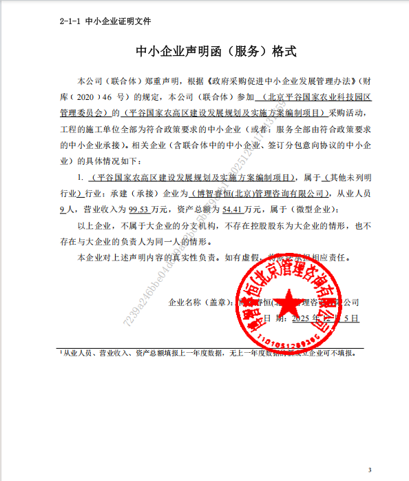 | 博智睿恒(北京)管理咨询有限公司 | 1 | 179.7万元 | 179.7万元 | 负责提供平谷国家农业科技园区升建国家农业高新技术产业示范区建设发展规划编制、实施方案编制、宣传片制作、PPT制作等服务工作。 |
