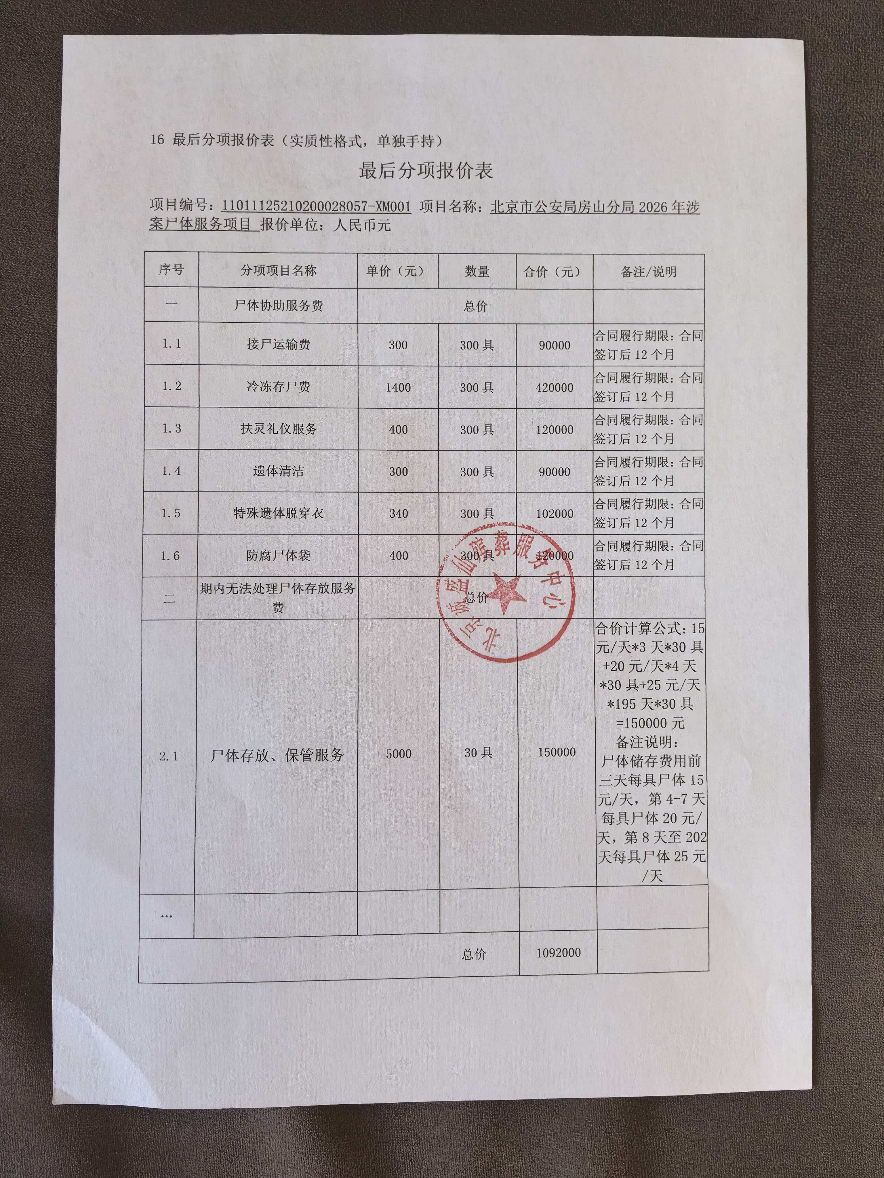 名称:北京市公安局房山分局2026年涉案尸体服务项目 服务范围:北京市行政区域内非正常死亡案件,约300具提供尸体协助服务(包括接尸运输、冷冻存尸、扶灵礼仪、尸体清洁、特殊尸体脱穿衣、防腐尸体袋)等相关服务;短期内无法处理的约30具涉案尸体的存放、保管等服务。 服务要求:详见磋商文件 服务时间:合同签订后12个月 服务标准:详见磋商文件 |