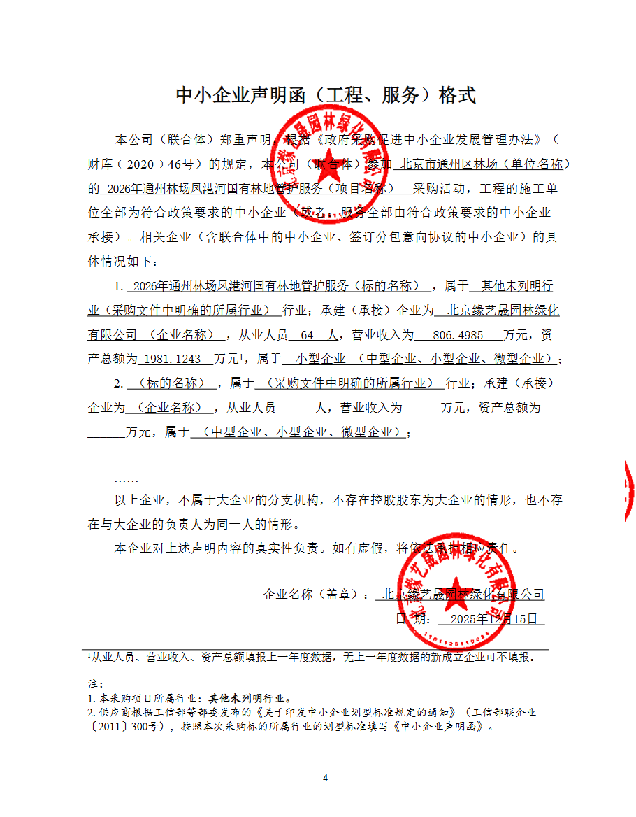 | 北京缘艺晟园林绿化有限公司 | 1 | 232.067959万元 | 232.067959万元 | 通州区凤港河1289.26亩国有林地的养护工作,详见招标文件 |