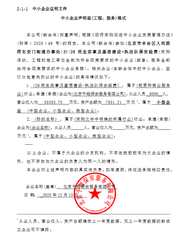 | 北京千翔保安服务有限公司 | 1 | 272.0304万元 | 272.0304万元 | 26民生实事及基层建设-执法队保安经费,具体详见竞争性磋商文件第四章。 |