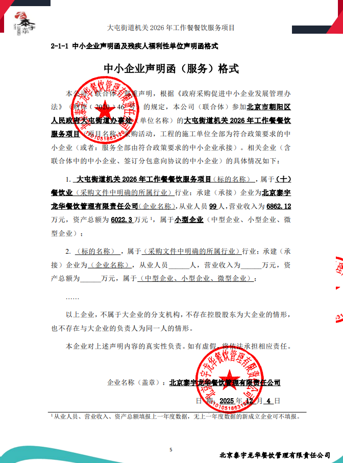 | 北京泰宇龙华餐饮管理有限责任公司 | 1 | 265.2万元 | 265.2万元 | 大屯街道机关2026年工作餐餐饮服务项目 |