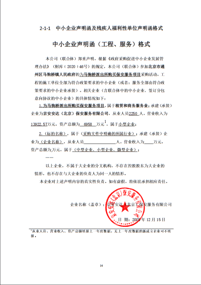 | 京安安达(北京)保安服务有限公司 | 1 | 466.65万元 | 466.65万元 | 解决派出所现有力量不足情况,需要加强力量配备。为确保马驹桥派出所工作正常开展,计划购买保安服务,负责配合开展日常工作。(具体需求详见招标文件) |