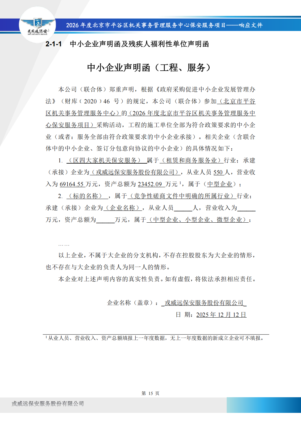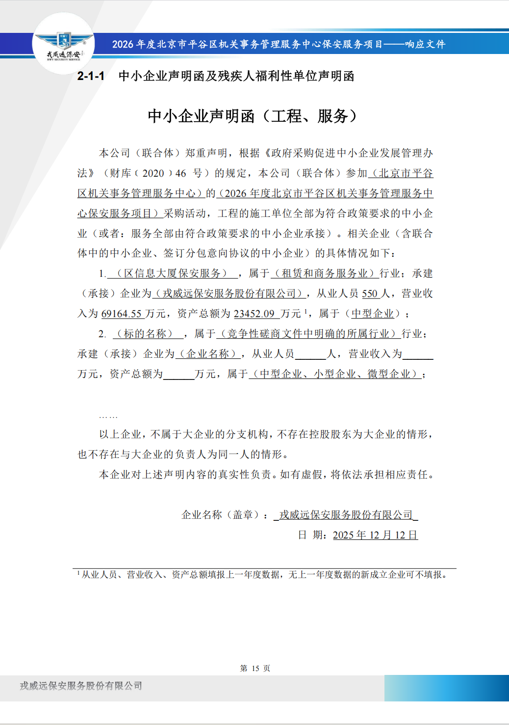 | 戎威远保安服务股份有限公司 | 北京市丰台区东滨河路2号6号楼2层2118室 | 91110106667502009D | 65.4 万元 | 评审总得分(综合评分法): 94.94 分 |