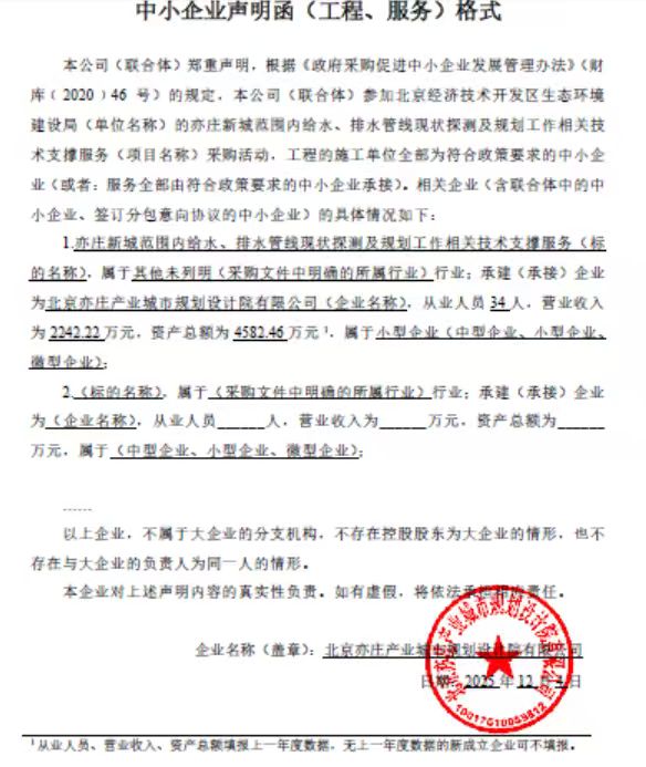 简要技术需求:需对亦庄新城新扩区域(165平方公里)内的对亦庄新城范围内的给水、排水管线现状探测,形成数据成果,完善亦庄新城涉水市政管网数据,数据内容包括地下管线的管线种类、管径、高程、长度、井盖、压力级别等信息。同时,按照采购人要求开展亦庄新城范围内给水、排水系统相关技术方案研究工作,结合区域涉水市政设施汇集数据和基础设施建设计划,为区域涉水设施管理工作提供技术咨询服务,高标准管理和服务亦庄新城供排水管网等涉水市政设施建设工作,保障亦庄新城城市建设和产业发展。