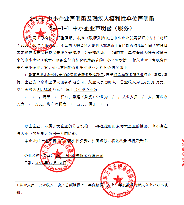 服务范围:为确保丰台区教育系统安全稳定,做好北京市丰台区群英幼儿园系统安全保卫值守工作,选择服务能力强、人员素质高的保安公司承担采购人关于“北京市丰台区群英幼儿园系统安全”。所需保安员人数为18人,消防控制室所需人员人数为4人,全部由保安公司进行人员的劳务派遣,由采购人统一管理。具体内容详见招标文件。