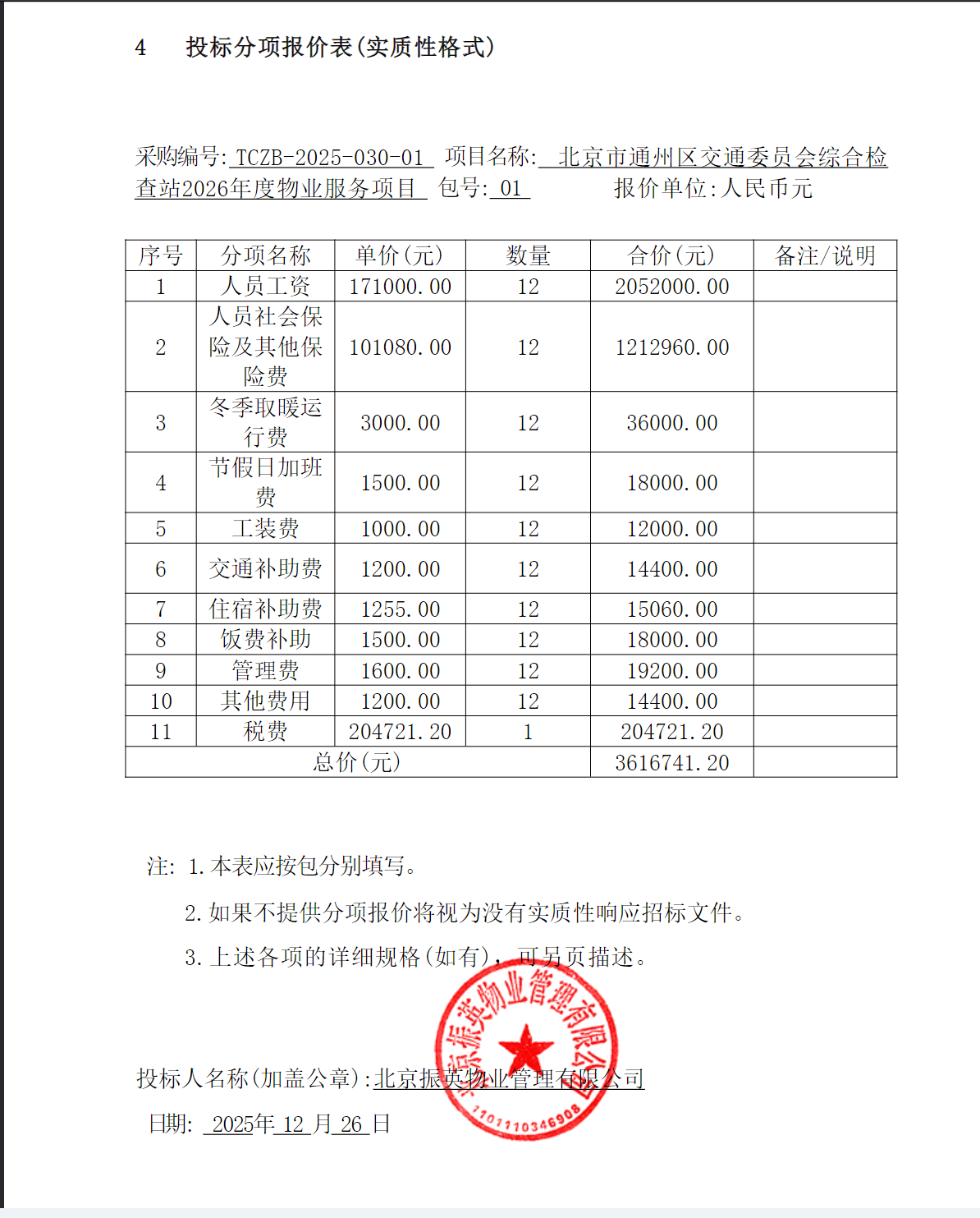 | 北京振英物业管理有限公司 | 1 | 361.67412万元 | 361.67412万元 | 详见招标文件 |
