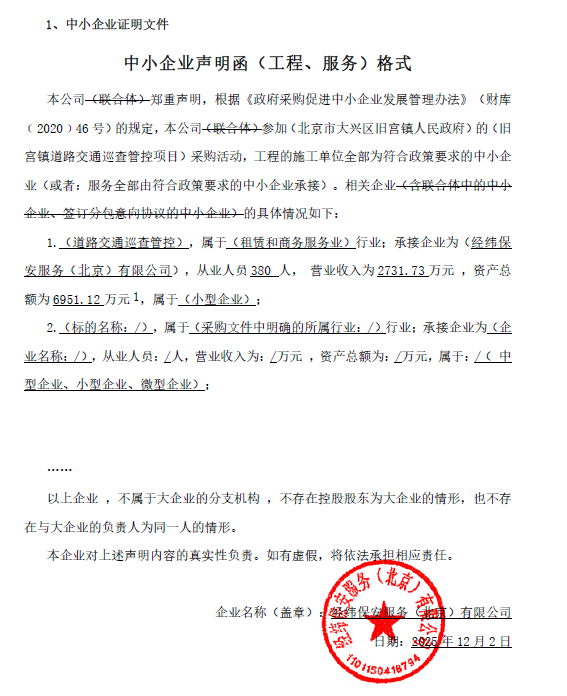 | 经纬保安服务(北京)有限公司 | 1 | 791.604万元 | 791.604万元 | 本项目采购旧宫镇道路交通巡查管控服务。项目预算金额:792.24万元。合同履行期限:2年,合同一年一签。 |