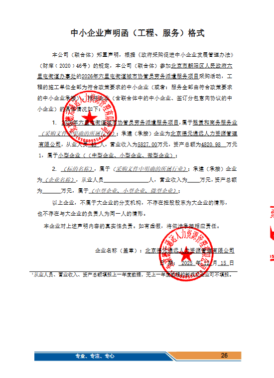 二、项目名称:2026年六里屯街道城市协管员劳务派遣服务项目