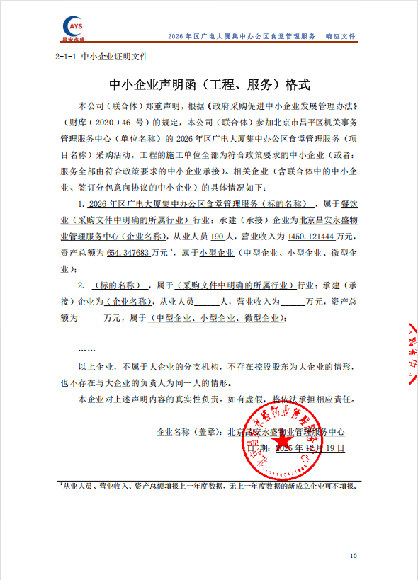 | 北京昌安永盛物业管理服务中心 | 2026年区广电大厦集中办公区食堂管理服务 | / | 1 | 140.66664万元 | 140.66664万元 | 详见竞争性磋商文件《第四章》采购需求。 |