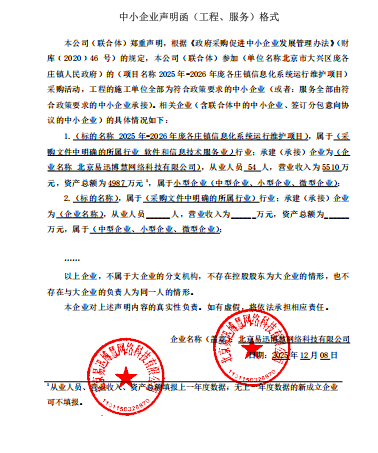 | 北京易迅博慧网络科技有限公司 | 1 | 390万元 | 390万元 | 为庞各庄镇各期项目所建设的视频监控系统、智慧门禁系统、车辆道闸系统、会议系统、承载网系统、网络安全系统、机房配套设备及相关软件平台,提供运行维护 |