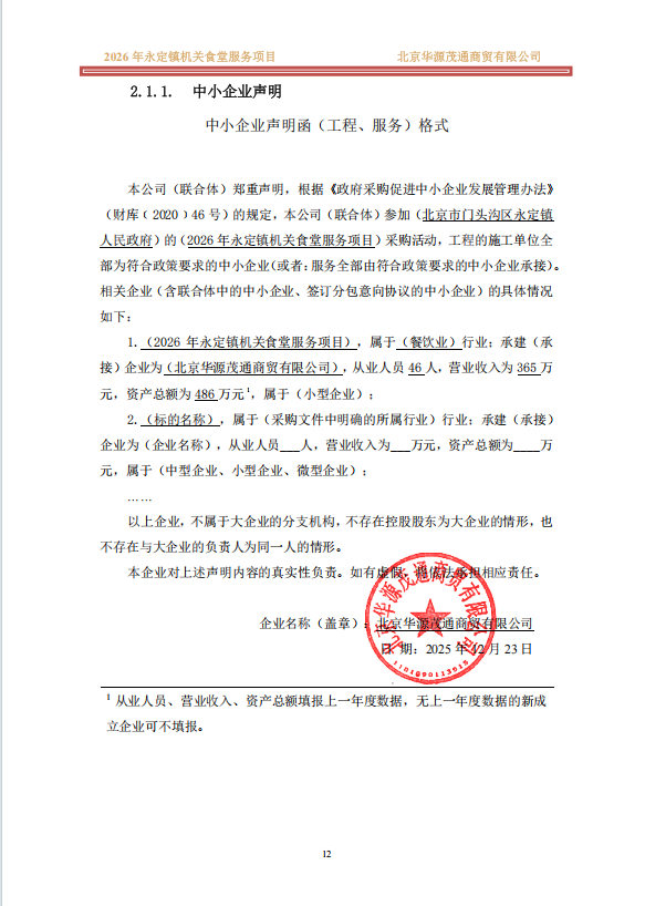 二、项目名称:2026年永定镇机关食堂服务项目