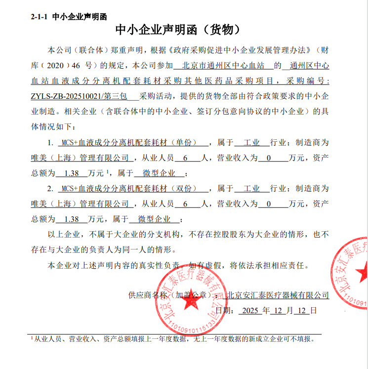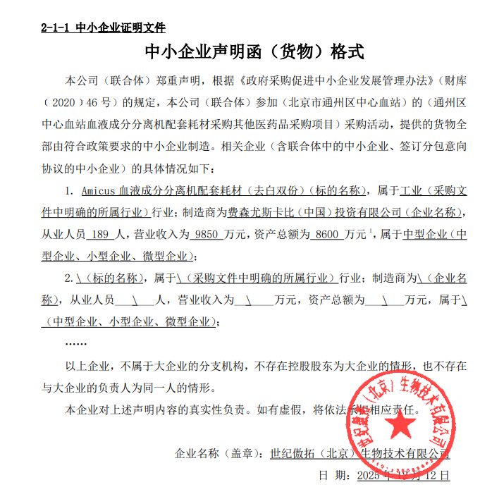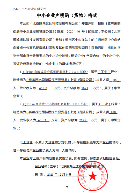 二、项目名称:通州区中心血站血液成分分离机配套耗材采购其他医药品采购项目