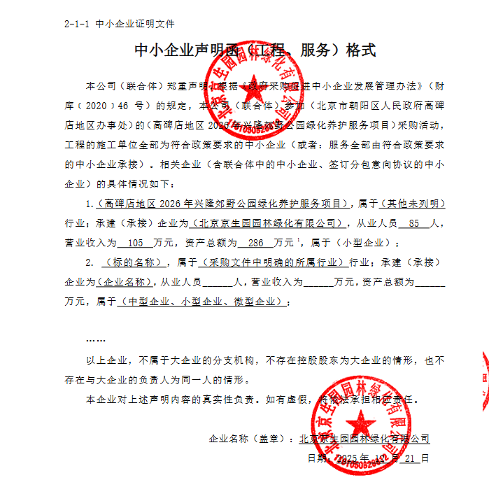 中标成交供应商名称:北京京生园园林绿化有限公司