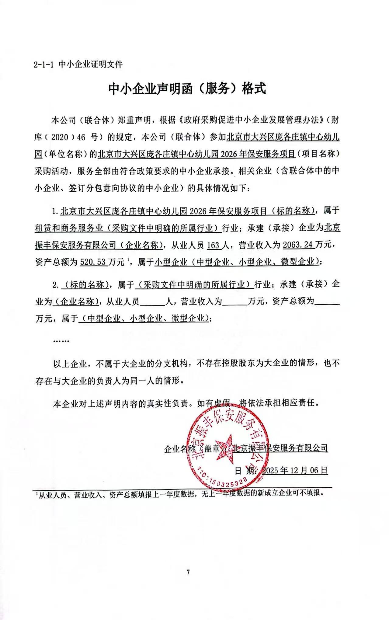 二、项目名称:北京市大兴区庞各庄镇中心幼儿园2026年保安服务项目