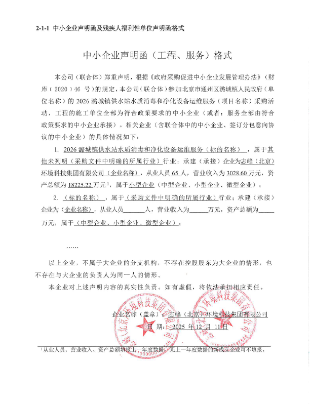| 志峰(北京)环境科技集团有限公司 | 1 | 170.26万元 | 170.26万元 | 负责潞城镇27个自备井共34台消毒设备和29套净化设备的日常管理、维修、加药等维护工作。服务内容为对饮用水消毒设备进行运行维护、药剂投加,包括但不限于设备消毒、清理、维修等,乙方应派专人每周对设备投加药剂,并使其满足规定的技术标准。具体详见竞争性磋商文件第五章《采购需求》。 |