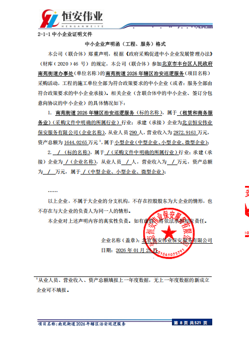 | 北京恒安伟业保安服务有限公司 | 1 | 100.28万元 | 100.28万元 | 为保障辖区安全稳定,结合辖区实际,2026年拟聘用保安23名,协助开展日常巡逻、防范、处置突发事件、重点时期桥梁看护及其他临时性工作。 |