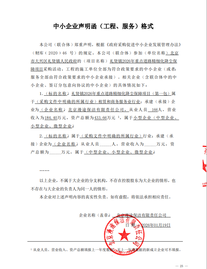 | 北京漫途保洁有限责任公司 | 1 | 140.348004万元 | 140.348004万元 | 负责礼贤镇2026年重点监测道路东片区面积约71826平方米的道路积尘负荷管控工作 |