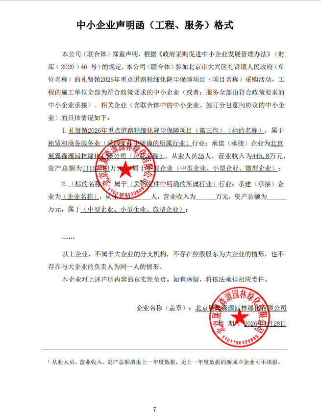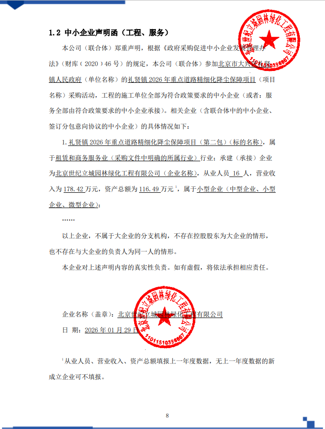 | 北京展翼森源园林绿化有限公司 | 1 | 95.386464万元 | 95.386464万元 | 负责礼贤镇2026年重点监测道路中片区面积约48816平方米的道路积尘负荷管控工作 | ||