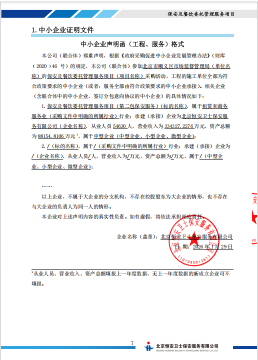 | 北京恒安卫士保安服务有限公司 | 1 | 98.028万元 | 98.028万元 | 聘请专业的第三方安保服务公司组织专业安保服务人员为北京市顺义区市场监督管理局所属区域内提供安保服务。 |