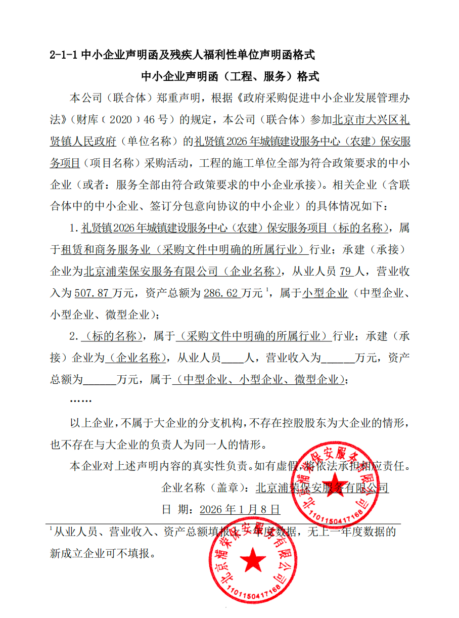 | 北京浦荣保安服务有限公司 | 1 | 399.9552万元 | 399.9552万元 | 详见招标文件 |