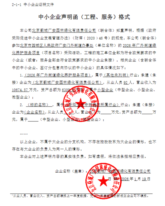| 北京蓟城广安园林绿化有限责任公司 | 1 | 283.58957万元 | 283.58957万元 | 1、对辖区内19.0773万平方米自管绿地、9986平方米失管绿地,合计20.0759万平方米,开展捡脏、浇水、修剪等日常养护工作及应急抢险、林木有害生物防治工作。(绿地内的乔灌木、绿篱、藤本植物、花卉、草坪、古树等均属于管理养护的工作对象)。自管绿地养护达到二级标准,失管绿地养护达到三级标准,满足服务良好,安全第一,质量达标。 2、自合同签订之日起一年 |
