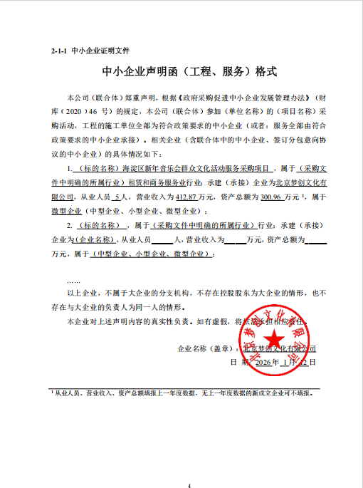| 北京梦创文化有限公司 | 1 | 296.99万元 | 296.99万元 | 2026年春节前,海淀区文化和旅游局计划继续举办2场高规格、有特色、暖人心的新年音乐会,满足区域人民日益增长的精神文化需求,提升市民的文化参与感和幸福感,提升区域文化活力和创新氛围。 合同履行期限:从2026年2月持续至2026年2月底,直至海淀区新年音乐会群众文化活动服务采购项目结项,具体时间安排以采购人通知为准。 |