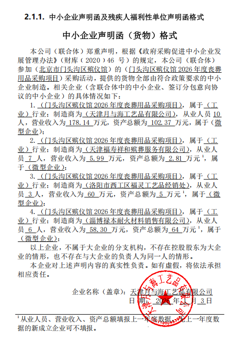 简要技术需求或服务要求:门头沟区殡仪馆2026年度丧葬用品采购项目主要包含寿衣、骨灰袋、灵位牌、包布等多项的小型丧葬用品